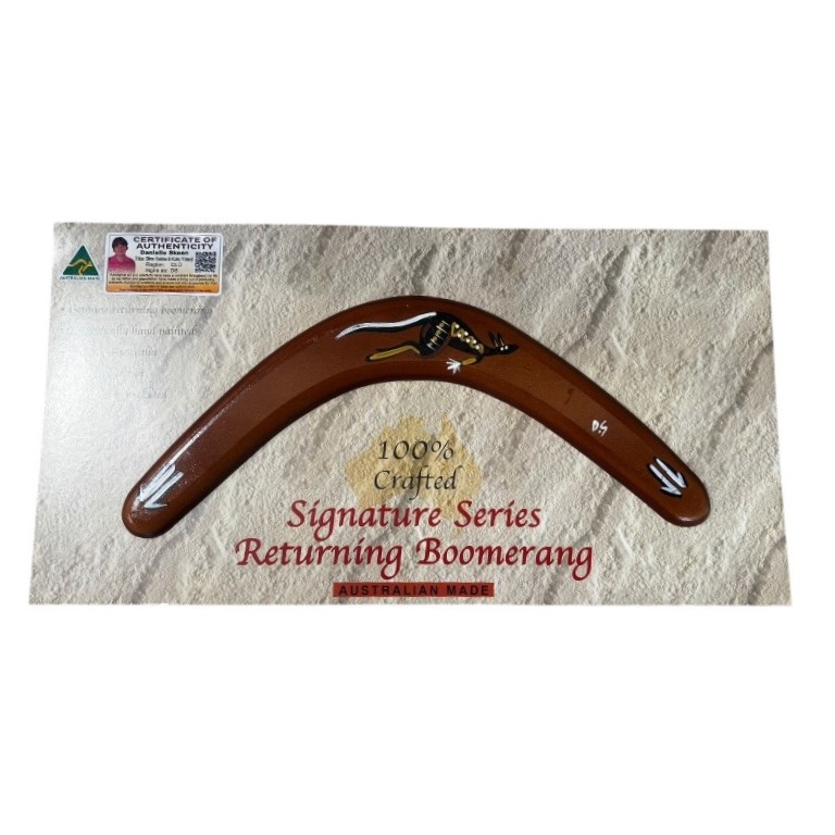 Each boomerang is individually hand-shaped and painted, ensuring no two pieces are alike. This makes every item a one-of-a-kind collectible and a unique addition to your home décor, office, or gift collection. Your purchase includes a certificate of authenticity and an information card explaining the importance of the artwork.