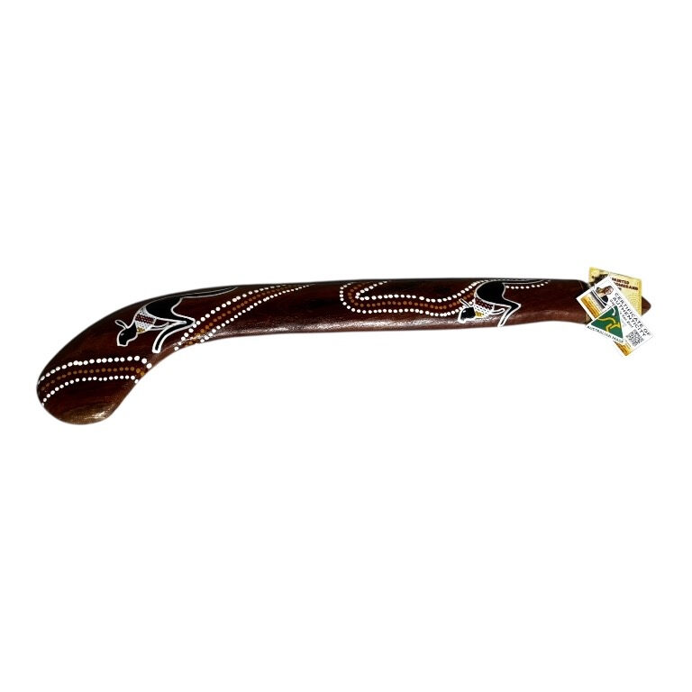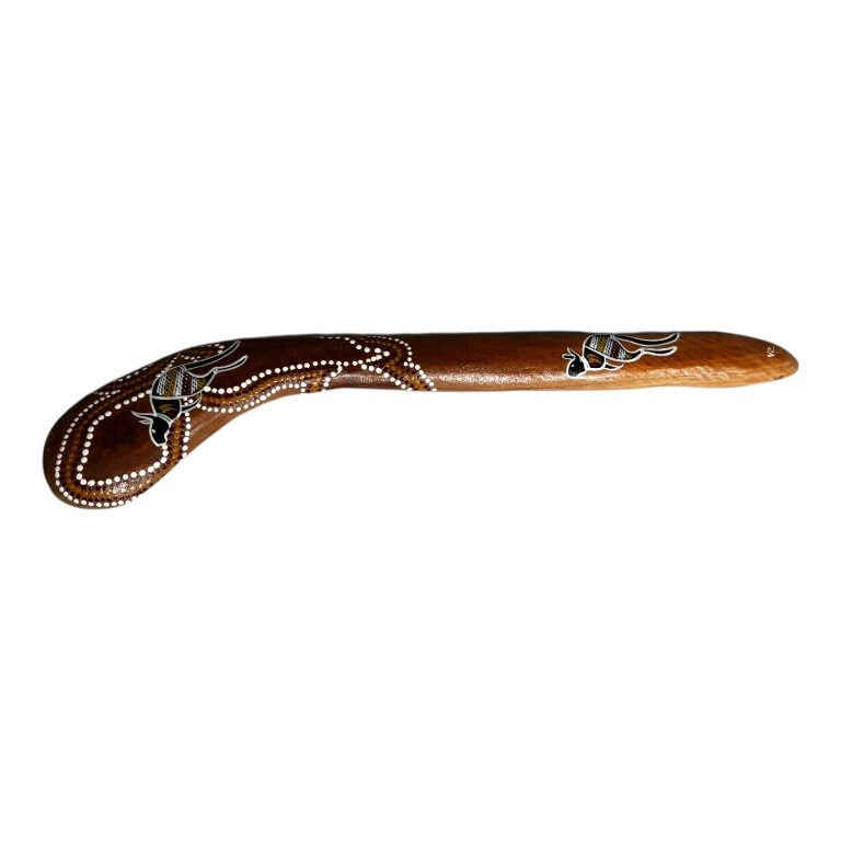 A killer boomerang, also known as a hunting boomerang or non-returning boomerang, is a traditional Indigenous Australian weapon, hand painted with traditional artwork, and designed to travel in a straight line rather than return to the thrower. Typically larger and heavier than returning boomerangs, these tools were primarily used for hunting birds and large game such as kangaroos and emus. However, their function extended well beyond hunting. Killer boomerangs could also be used to make fire, dig into the earth, and serve as musical instruments. In ceremonial gatherings such as corroborees, they were rhythmically clapped together with another boomerang to accompany song and dance. These versatile, aerodynamic weapons reflect the deep cultural knowledge and craftsmanship of Indigenous Australian communities, and today they are valued both for their practical heritage and their artistic, contemporary expression.