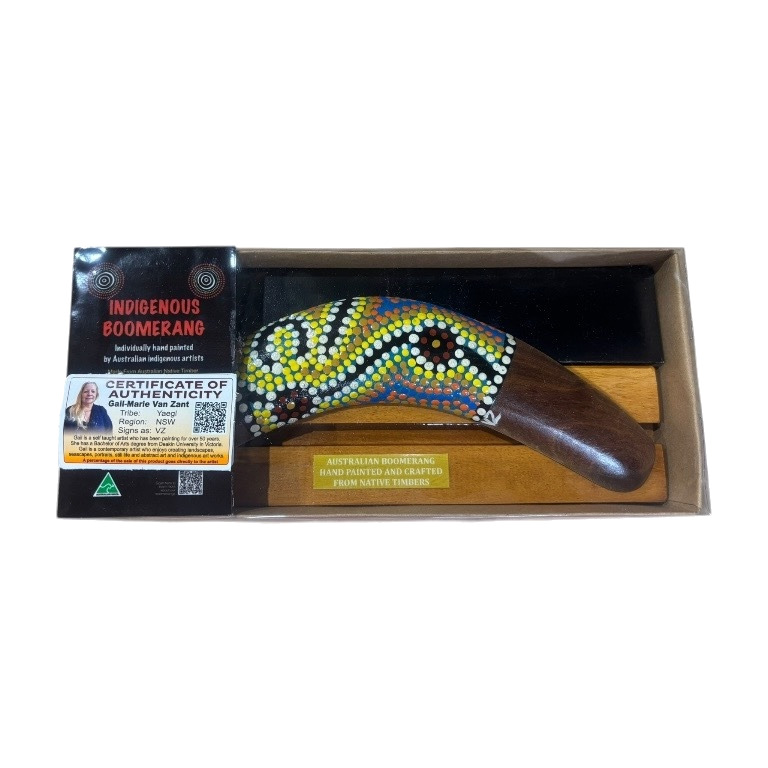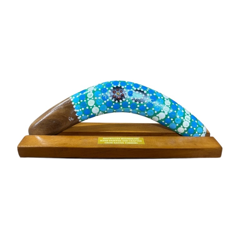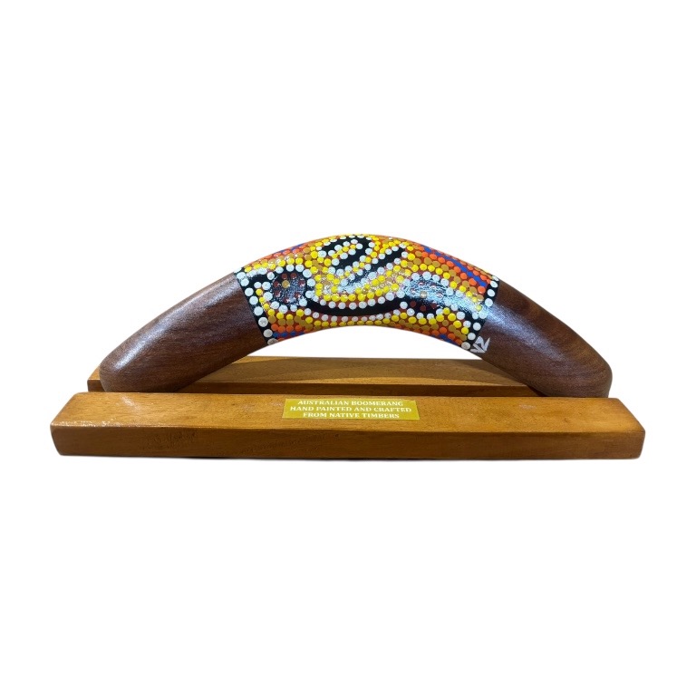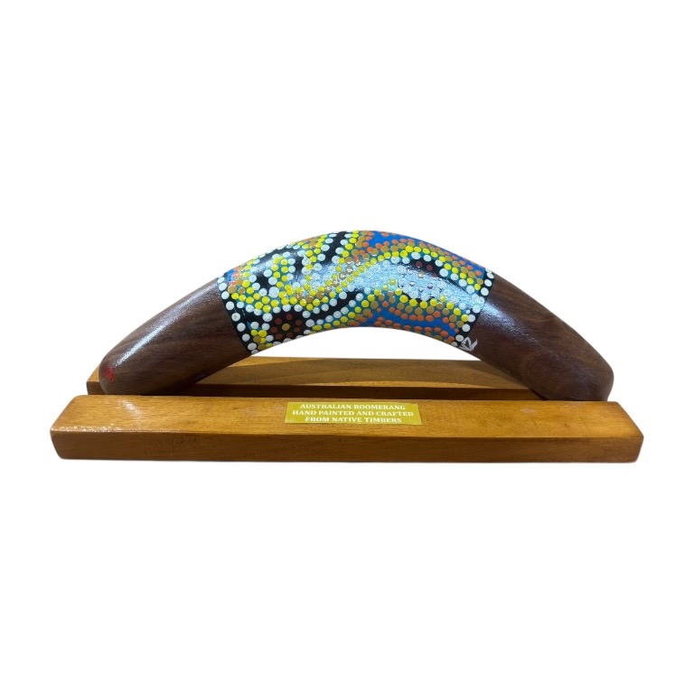 Discover the beauty and cultural significance of Indigenous art with our Hand-Painted 10-Inch (25cm) Dot Boomerang with box and display stand — a unique and authentic Indigenous Australian souvenir handcrafted in Australia. Each boomerang features a vibrant, contemporary Dotted design, carefully hand-painted by our team of Indigenous Australian artists. Each piece is presented in a box and comes complete with a display stand, making it ideal for gifting or showcasing in your home or office. These intricate artworks draw on cultural stories and traditional symbols, making every piece a meaningful expression of Indigenous heritage.