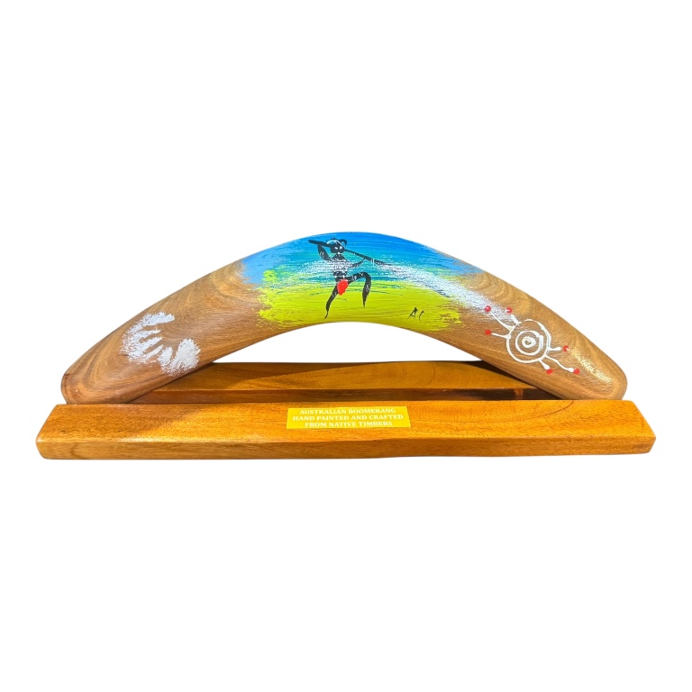 Discover the beauty and cultural significance of Indigenous art with our Hand-Painted 12-Inch (30cm) Boomerang with box and display stand — a unique and authentic Indigenous Australian souvenir handcrafted in Australia. Each piece is presented in a box and comes complete with a display stand, making it ideal for gifting or showcasing in your home or office. Each boomerang features a vibrant, contemporary design, carefully hand-painted by Arthur Conlon . These intricate artworks draw on cultural stories and traditional symbols, making every piece a meaningful expression of Indigenous heritage.
