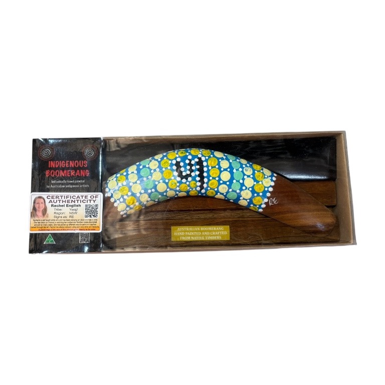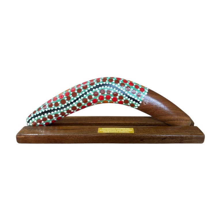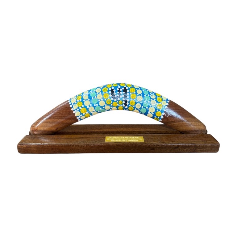 Discover the beauty and cultural significance of Indigenous art with our Hand-Painted 12-Inch (30cm) Dot Boomerang with box and display stand — a unique and authentic Indigenous Australian souvenir handcrafted in Australia. Each boomerang features a vibrant, contemporary Dotted design, carefully hand-painted by our team of Indigenous Australian artists. Each piece is presented in a box and comes complete with a display stand, making it ideal for gifting or showcasing in your home or office. These intricate artworks draw on cultural stories and traditional symbols, making every piece a meaningful expression of Indigenous heritage.