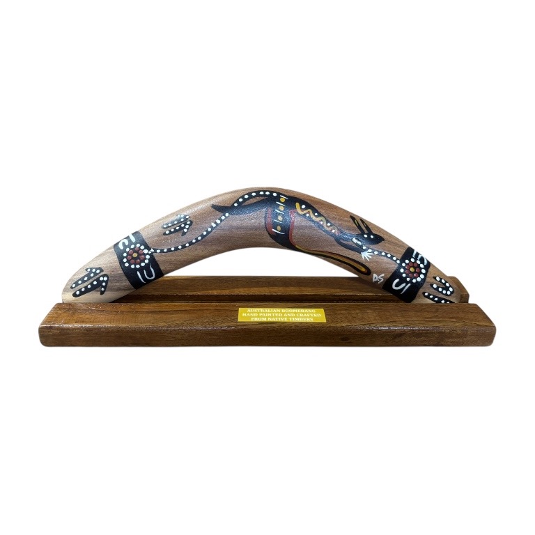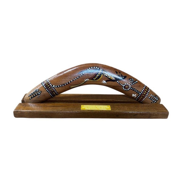Discover the beauty and cultural significance of Indigenous art with our Hand-Painted Animal /Weapon 14-Inch (35cm) Boomerang with box and display stand— a unique and authentic Indigenous Australian souvenir handcrafted in Australia. Each piece is presented in a box and comes complete with a display stand, making it ideal for gifting or showcasing in your home or office. Each boomerang features a vibrant, Traditional design featuring an animal and weapons, carefully hand-painted by our team of Indigenous Australian artists. These intricate artworks draw on cultural stories and traditional symbols, making every piece a meaningful expression of Indigenous heritage.