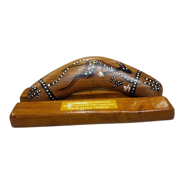 Discover the beauty and cultural significance of Indigenous art with our Hand-Painted Animal /Weapon 6-Inch (15cm) Boomerang with box and display stand— a unique and authentic Indigenous Australian souvenir handcrafted in Australia. Each piece is presented in a box and comes complete with a display stand, making it ideal for gifting or showcasing in your home or office. Each boomerang features a vibrant, Traditional design featuring an animal and weapons, carefully hand-painted by our team of Indigenous Australian artists. These intricate artworks draw on cultural stories and traditional symbols, making every piece a meaningful expression of Indigenous heritage.