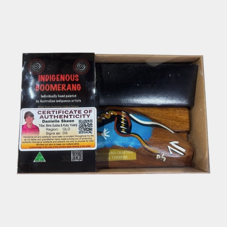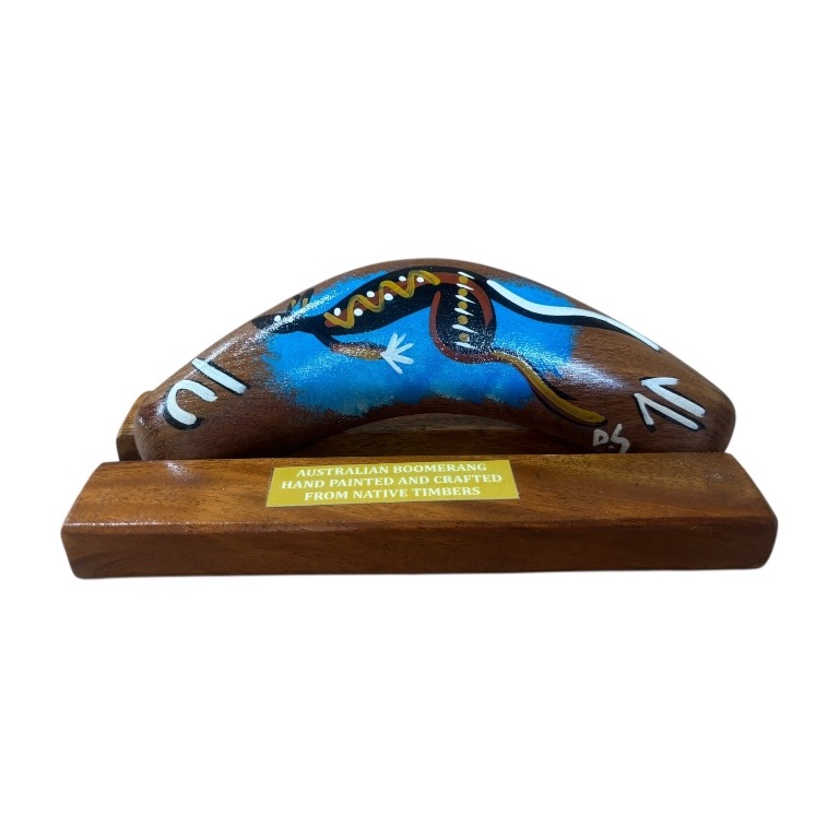 Discover the beauty and cultural significance of Indigenous art with our Hand-Painted 6-Inch (15cm) Boomerang with box and display stand — a unique and authentic Indigenous Australian souvenir handcrafted in Australia. Each boomerang features a vibrant, simple contemporary animal design, carefully hand-painted by our team of Indigenous Australian artists. Each piece is presented in a box and comes complete with a display stand, making it ideal for gifting or showcasing in your home or office. These intricate artworks draw on cultural stories and traditional symbols, making every piece a meaningful expression of Indigenous heritage.