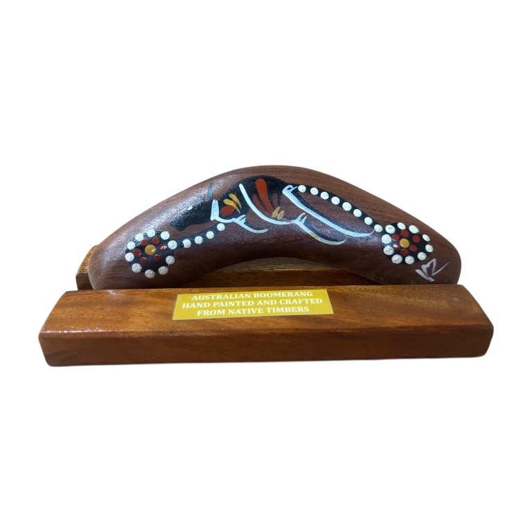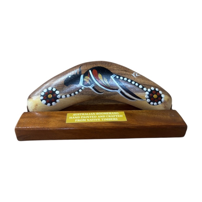 Discover the beauty and cultural significance of Indigenous art with our Hand-Painted Traditional 8-Inch (20cm) Boomerang with box and display stand — a unique and authentic Indigenous Australian souvenir handcrafted in Australia. Each boomerang features a traditional design, carefully hand-painted by our team of Indigenous Australian artists. Each piece is presented in a box and comes complete with a display stand, making it ideal for gifting or showcasing in your home or office. These intricate artworks draw on cultural stories and traditional symbols, making every piece a meaningful expression of Indigenous heritage.