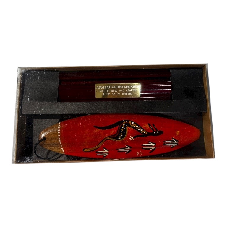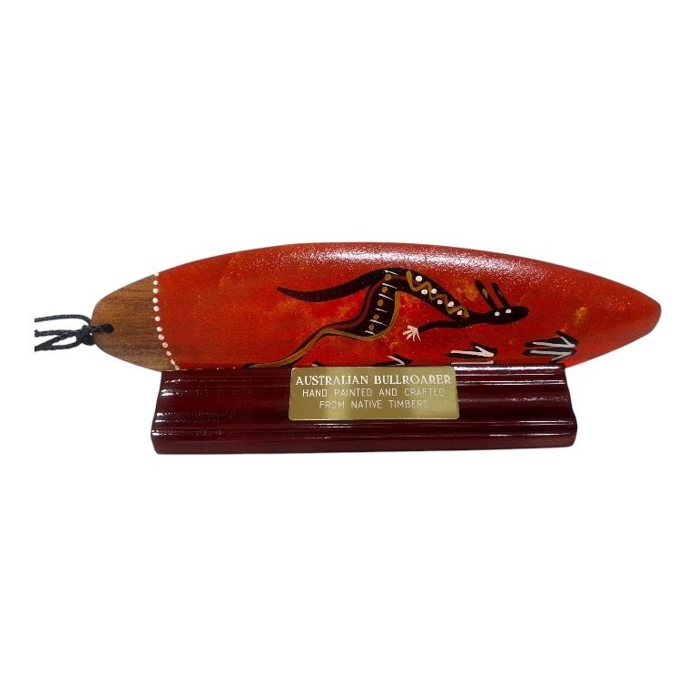 Hand painted with contemporary artwork on a 26cm bullroarer, comes with box and stand, the Australian bullroarer is a traditional Indigenous instrument used for communication, ceremonial purposes, and spiritual connection. Crafted from a flat, elongated piece of wood attached to a cord, the bullroarer produces a deep, humming or roaring sound when swung through the air, with the vibration capable of carrying over long distances. Traditionally used by Indigenous Australian communities during initiation ceremonies, storytelling, and sacred rituals, the bullroarer holds strong cultural and spiritual significance. Today, these handcrafted instruments are appreciated not only for their unique sound and function but also as culturally significant artefacts that reflect the rich traditions and evolving artistic expressions of Indigenous Australia.