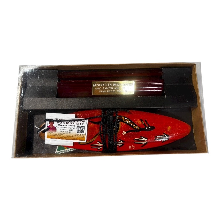 Each bullroarer is individually hand-shaped and painted, ensuring no two pieces are alike. This makes every item a one-of-a-kind collectible and a unique addition to your home décor, office, or gift collection. Your purchase includes a certificate of authenticity and an information card explaining the importance of the artwork and the Brigalow timber used.