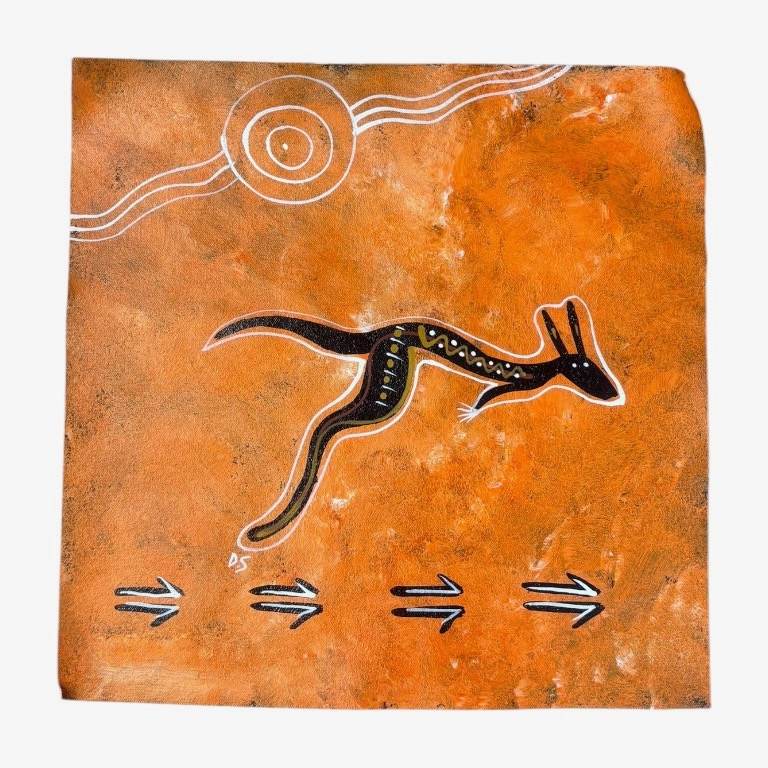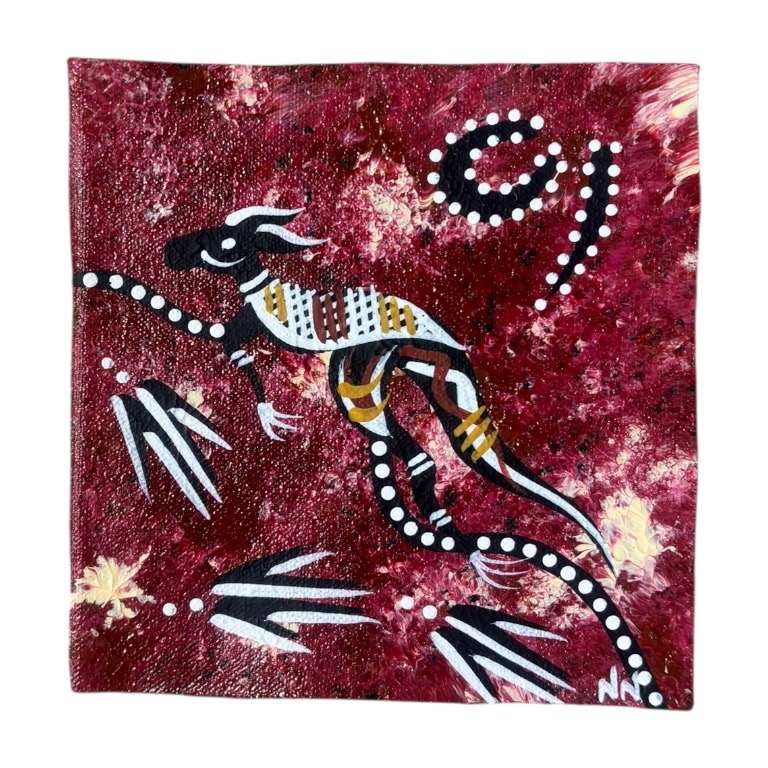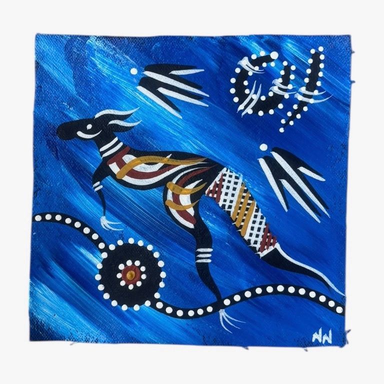 Canvas is approximately 10x10cm, hand-painted with authentic Indigenous Australian artwork that reflects deep cultural meaning and connection to Country. Each piece is created by talented Indigenous artists who share their stories, symbols, and traditions through vibrant colours and intricate brushwork. Every canvas is a one-of-a-kind original, rich in storytelling, cultural expression, and visual impact.