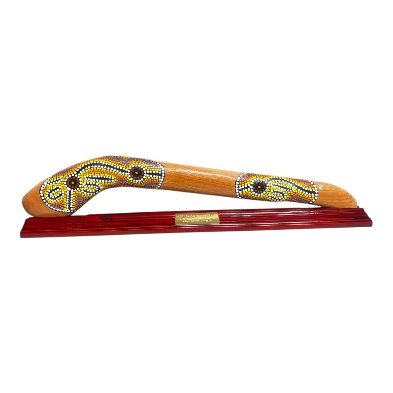 Each boomerang is individually hand-shaped and painted, ensuring no two pieces are alike. This makes every item a one-of-a-kind collectible and a unique addition to your home décor, office, or gift collection. Your purchase includes a certificate of authenticity and an information card explaining the importance of the artwork and the Brigalow timber used.