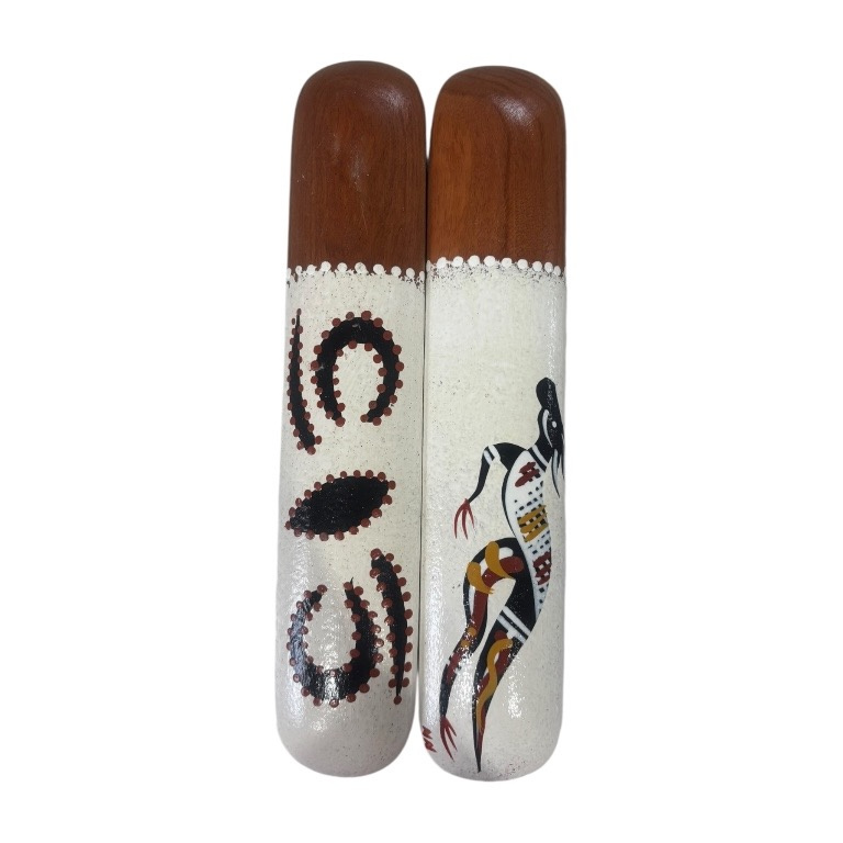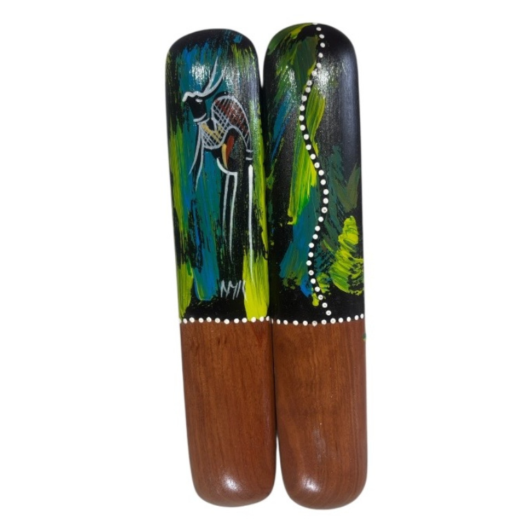 Hand Painted with Contemporary Artwork. Our music sticks are crafted from durable Ironbark timber, a native Australian hardwood prized for its strength and natural resonance. Each stick is carefully shaped and then hand-painted by Aboriginal artists with vibrant animal designs inspired by Australia’s native wildlife.