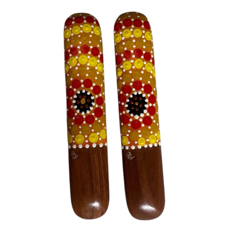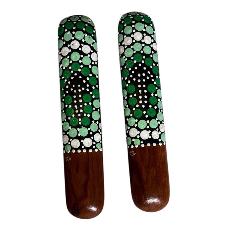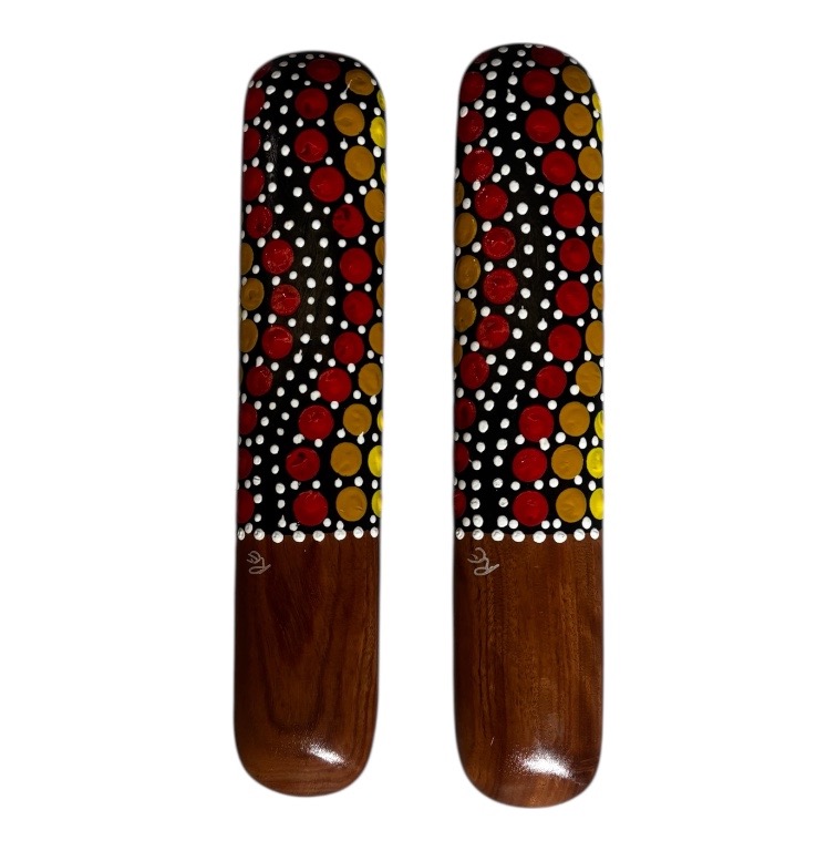 Hand Painted with Dot Artwork. Our music sticks are crafted from durable Ironbark timber, a native Australian hardwood prized for its strength and natural resonance. Each stick is carefully shaped and then hand-painted by Aboriginal artists with vibrant animal designs inspired by Australia’s native wildlife.