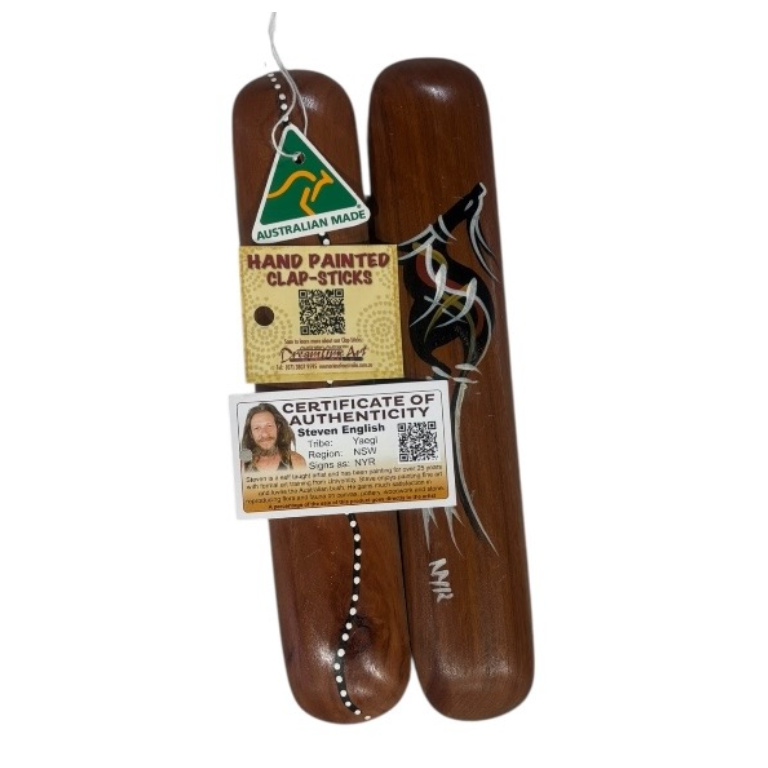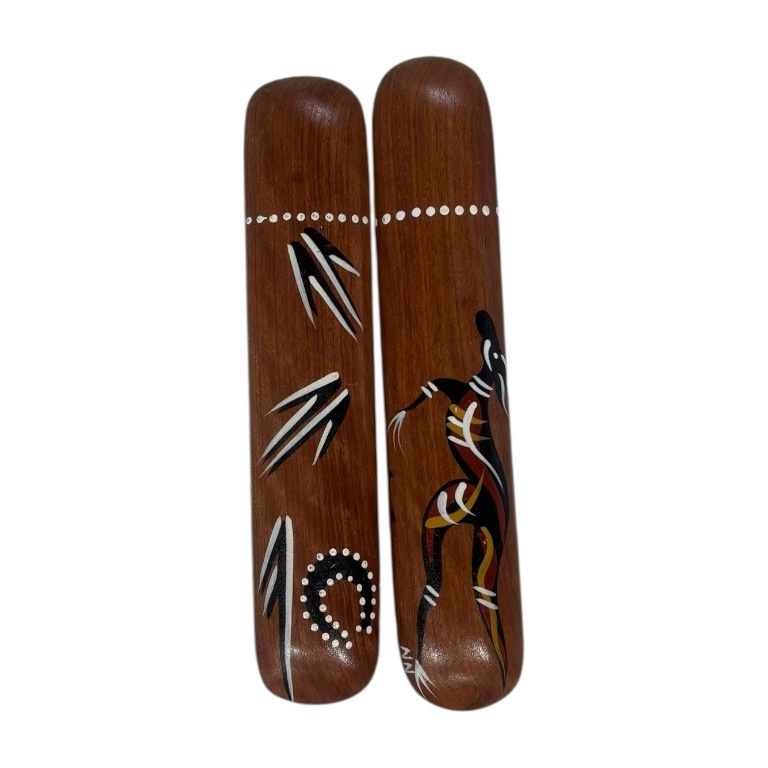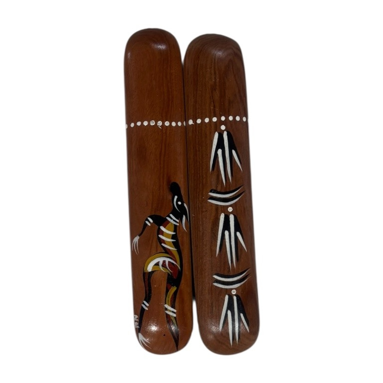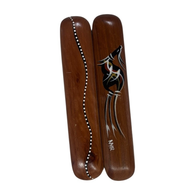 Hand Painted with Traditional Artwork. Our music sticks are crafted from durable Ironbark timber, a native Australian hardwood prized for its strength and natural resonance. Each stick is carefully shaped and then hand-painted by Aboriginal artists with vibrant animal designs inspired by Australia’s native wildlife.